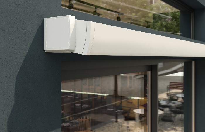 Square shape full cassette, but with rounded edges, this is a stylish folding arm awning manufactured up to a respectable 6000mm wide and available as manual or electric operated with optional LED lighting in the arms controlled by the remote handset or smartphone with optional Somfy smart hub.